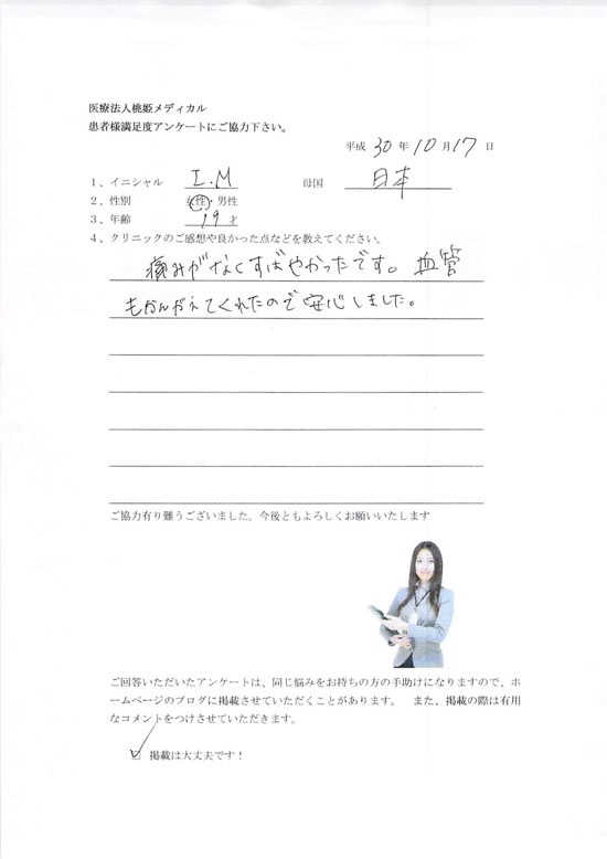 痛みがなくすばやかったです。血管もかんがえてくれたので安心しました。