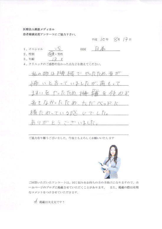 私の姉は機械でやったため、音が怖いと言っていましたが、前もってますいをやったため機械を使わず、音もなかったため、だだベッドに横たわっている感じでした。ありがとうございました。