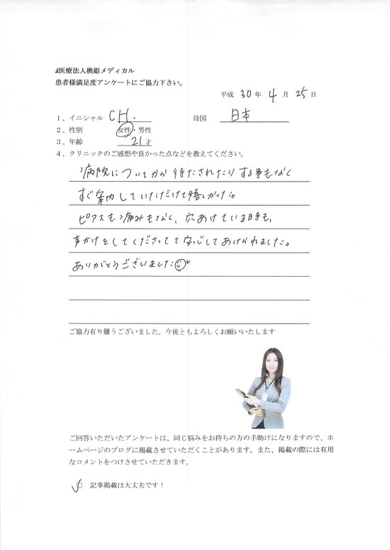 病院についてから待たされたりする事もなくすぐ案内していただけて嬉しかった。ピアスも痛みもなく、穴あけている時も声かけをしてくださって安心してあけられました。ありがとうございました。