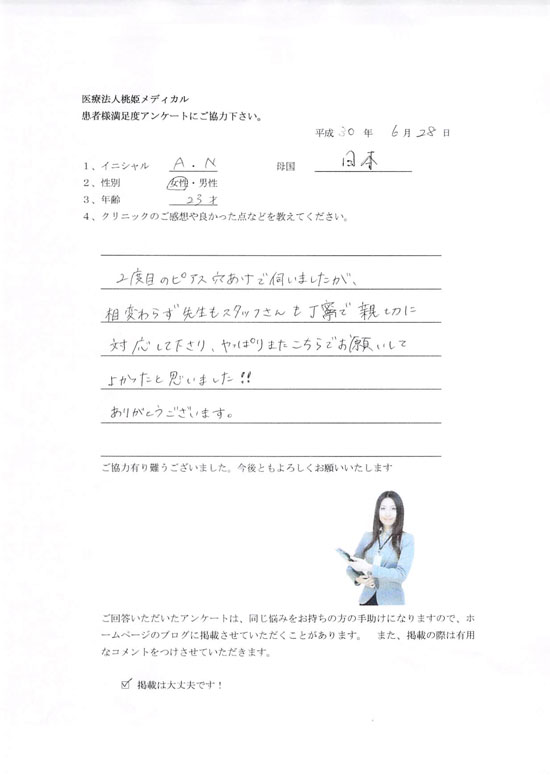 2度目のピアス穴あけで伺いましたが、相変わらず先生もスタッフさんも丁寧で親切に対応して下さり、やっぱりこちらでお願いしてよかったと思いました!!ありがとうございます。