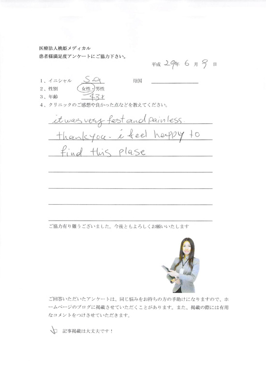 東京銀座2丁目で局所麻酔とニードルにより鼻にチタンピアス穴開けを行った43才外国人女性のご感想 東京都港区 2017/6/9
