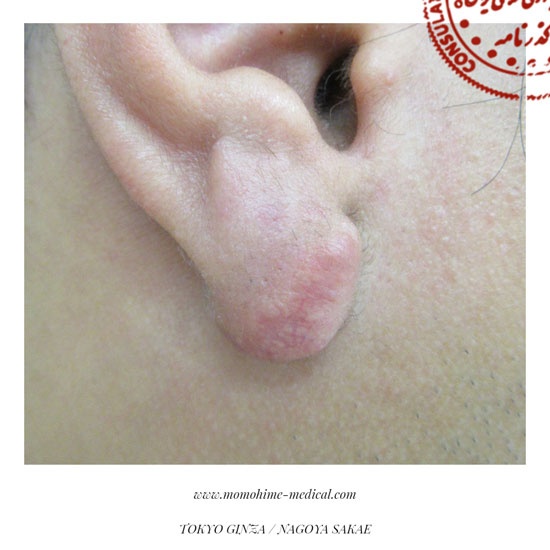 顔のケロイド 好発部位は、主に左右の頬下のアゴ部分と耳垂・耳介。