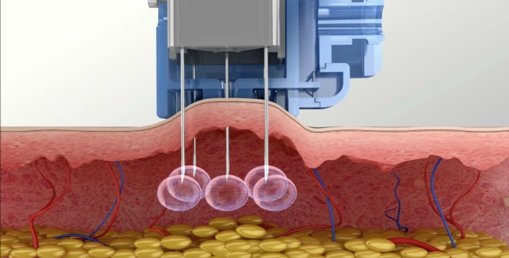 針から、薬剤を痛み少なく、面状に均一に注射します。薬液や血液が逆流しないよう逆流ブロック構造が安全で正確な注入を行います。注入量と深さは、患者様のお肌に合わせて調節することができます。